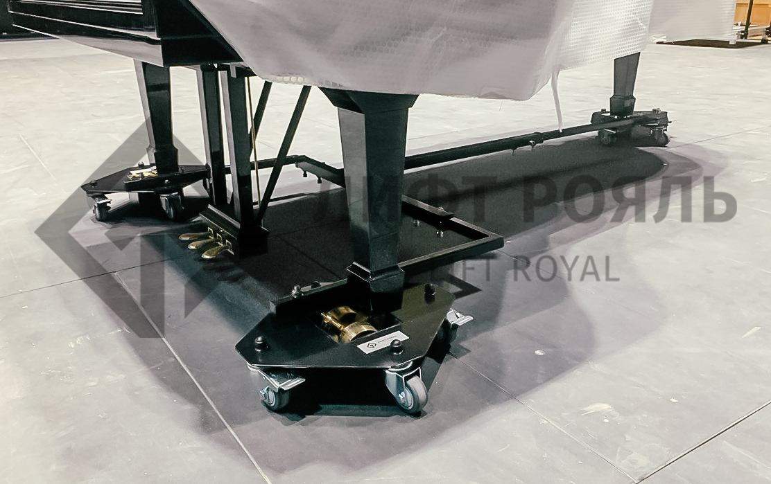 Размер установочной площадки под ролик рояля 150 х 150 мм, что подходит для больших концертных роялей (пример Steinway & Sons D-274 на фото).